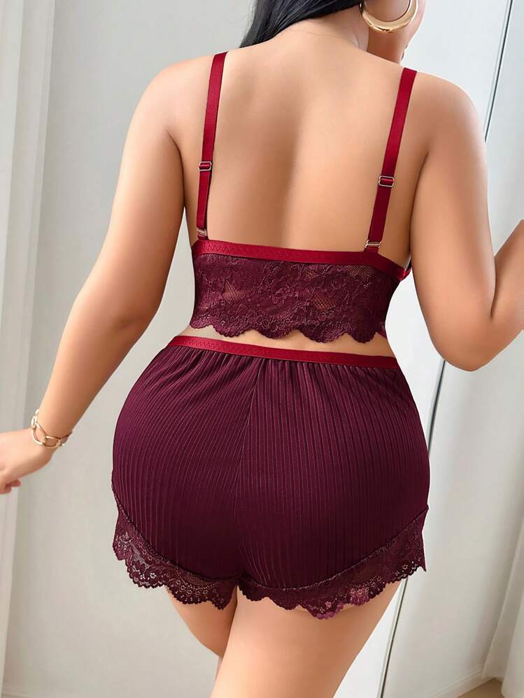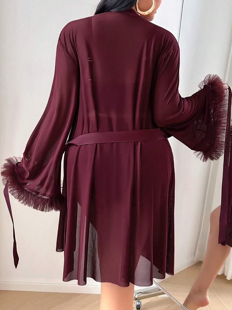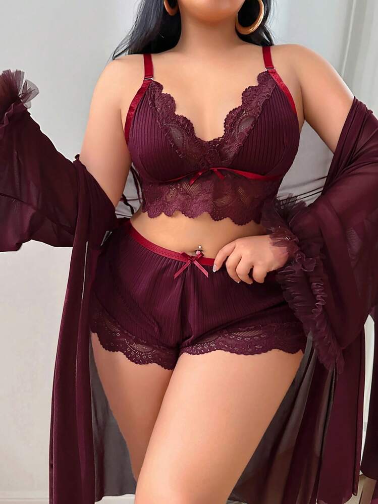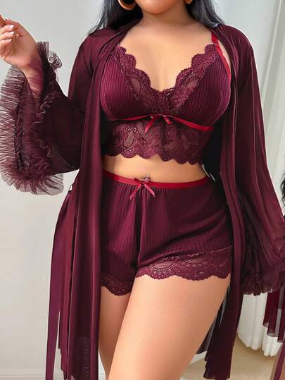 مجموعة 3 قطع: قميص نوم قصير مع تصميم قطع من الدانتيل + رداء ضيق مع تطريز زهري ثلاثي الأبعاد